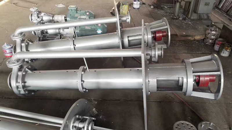 液下泵為單級單吸,液下式離心泵,用聯接管連接泵的水力部件和軸承體 及支承盤,液體由出水管部件排出,葉輪為半開式葉輪,並在葉輪葉片進口延 伸處設有攪拌葉片,可輸送含有顆粒的介質。該泵的液下深度為8m,當液 下長度超過1.5m時,就要采用接軸結構,並在接軸處的附近裝有滾動軸承(油 脂潤滑),采用聯軸套連接。泵下麵的滾動軸承用機械密封與液麵隔離,不 接觸液體。泵軸承有足夠的剛度,可以保證泵平衡運行,如果在深進中運行, 可以加置一條吸入管(合同中注明)。